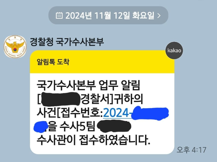 경찰서 방문하여 재촉 한 다음 날 오전에 함께 사건이 접수되었음을 알리는 카톡이 왔습니다.
