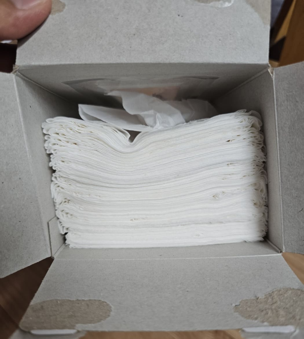 각 티슈를 박스에서 꺼냅니다. 이때 티슈가 분리되지 않도록 해주세요. 각 티슈는 한 장씩 교차로 겹쳐져 있기 때문에 그냥 꺼내다 놓치기라도 하면 다시 정리해야 합니다. 그러면 그냥 쓰시는 게 나아요. 정리하기 너무 힘들거든요.