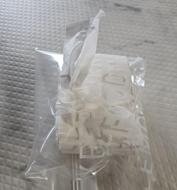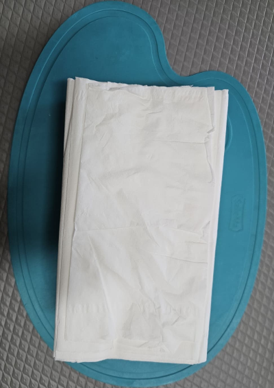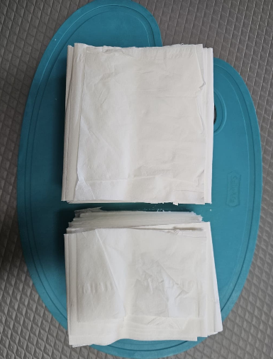 꺼낸 티슈를 도마 위에 놓고 칼로 2/3 사이즈로 잘라줍니다. 만약 칼이 없다면 가위를 사용하시면 되는데 여러 장씩 잡고 자르면 편합니다. 잘린 티슈를 두 개의 더미로 나눕니다.