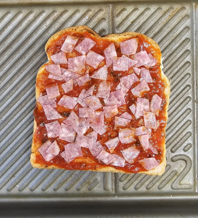재료 : 식빵 1장, 토마토스파게티소스 또는 케첩 1.5큰술, 슬라이스치즈 1장, 샌드위치용 햄 1장(없으면 일반 햄), 모차렐라치즈 조금, 냉장고에 남아있는 자투리 야채가 있다면 사용하세요. 우리 집 둘째는 야채 싫어하는 녀석이라 아침은 입맛에 맞춰 햄만 넣어준답니다.