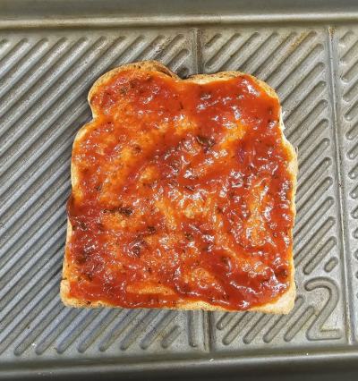 1. 식빵 1장을 준비하여 토마토소스를 골고루 발라줍니다.