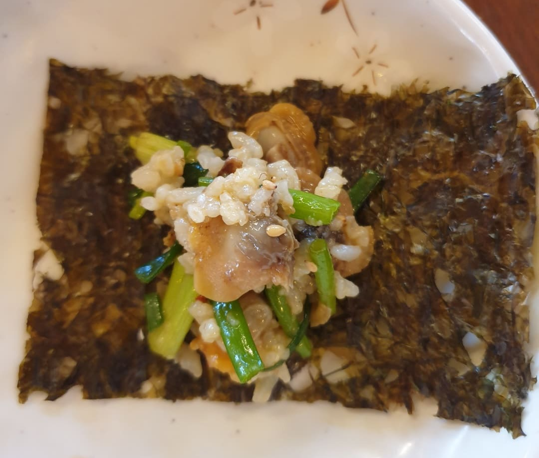 꼬막비빔밥은 반찬으로 나오는 김과 함께 싸먹으니 또 다른 맛을 즐길 수 있어 좋더라고요. 꼬막비빔밥의 마늘종이 신의 한 수인 듯....