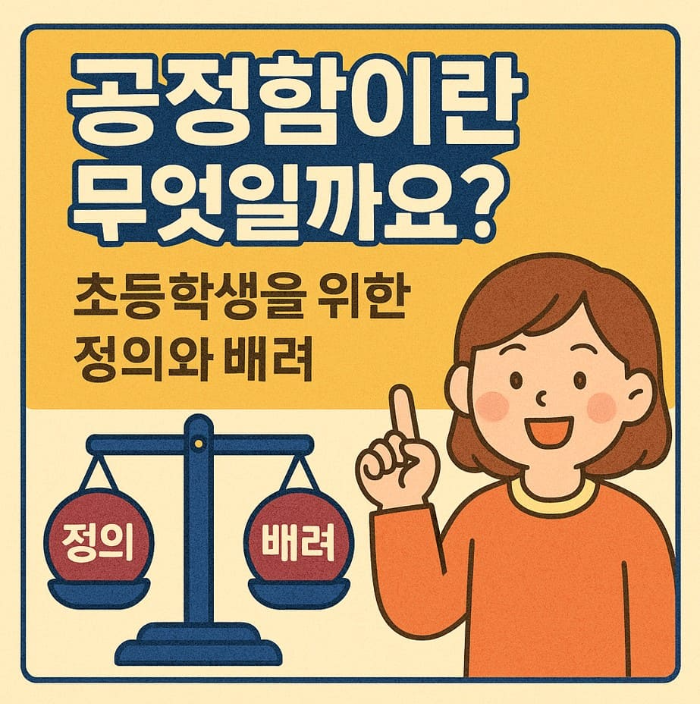 공정함이란 대체 무엇일까요? 초등학생도 이해할 수 있도록 ‘공정함’의 개념과 차이, 평등, 배려에 대해 다양한 예시를 이용해 '공정함'이라는 개념을 쉽고 재미있게 설명해 볼게요.