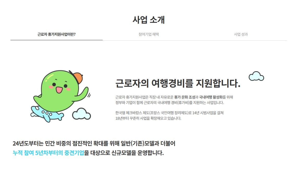 근로자가 20만 원을 부담하게 되면 정부가 10만 원, 기업이 10만 원씩 지원하는 방식으로 총 40만 원의 여행 경비가 준비됩니다. 지원금을 받으면 다양한 국내 여행 상품을 이용할 수 있습니다