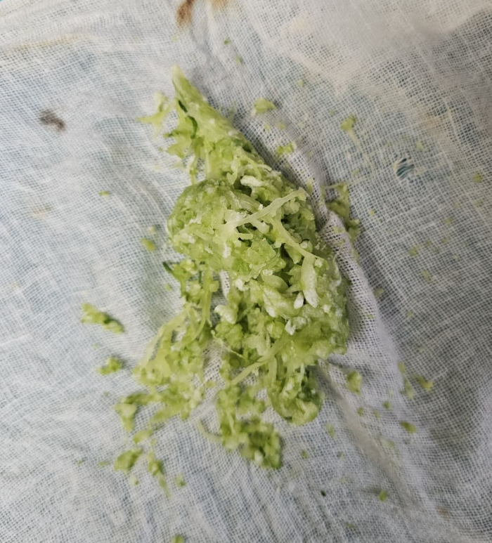 4. 오이는 10분 후 거즈나 헝겊에 올려 수분제거를 위해 힘껏 짜주세요. 수분이 최대한 제거될 수 있도록 열심히 짭니다. 오이의 수분이 이 소스의 농도를 조절하고 맛을 유지하게 하므로 수분은 거의 없도록 준비합니다.