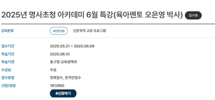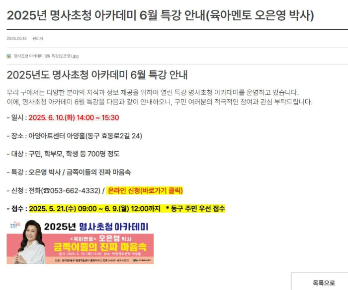 - 기타 : 대구 동구주민 우선 접수 / 특강 당일 사전신청 확인 후 입장가능
