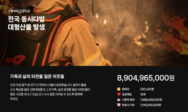 네이버와 카카오는 각 10억원씩 기부하였습니다. 이 회사들의 기부 플랫폼을 통한 긴급 모금에는 27일 오전 기준으로 총 100억 원이 넘는 성금이 모였습니다.