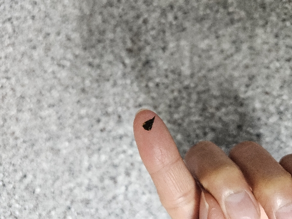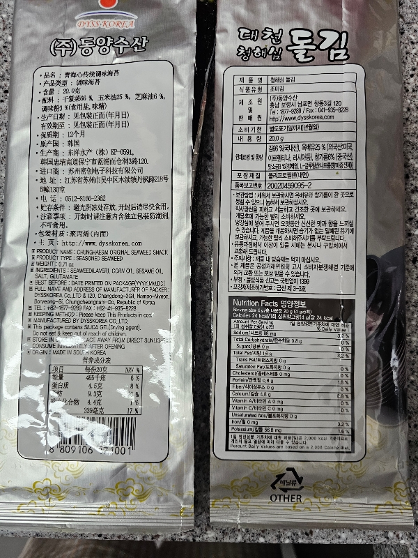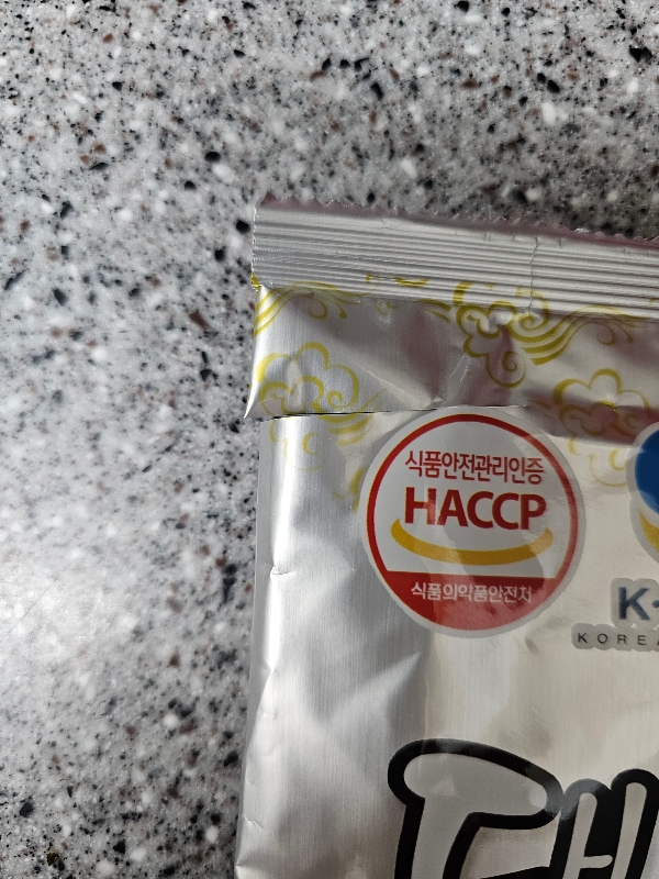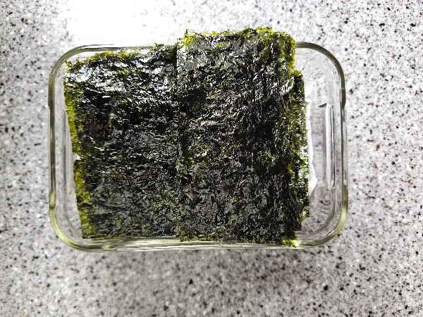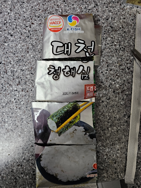 김 한봉지 자르는데 이렇게 김부스러기 하나 떨어졌네요.