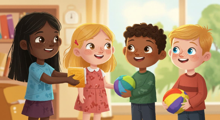 나눔은 내가 가진 것 중 일부를 다른 사람과 함께 쓰거나 주는 거예요. 음식, 시간, 물건, 관심… 돈이 아니어도 나눌 수 있는 게 아주 많답니다.