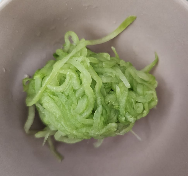 1. 먼저 오이 껍질을 벗기고 채칼을 이용해 빨리 채를 썰어주세요.