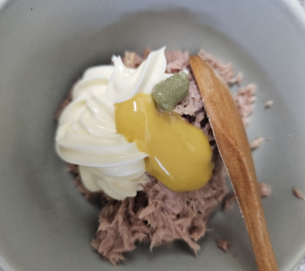 3. 참치캔을 따소 참치 기름을 최대한 빼주세요. 그리고 참치를 그릇에 옮겨 담고 마요네즈, 허니머스터드, 와사비를 넣고 버무려주세요.