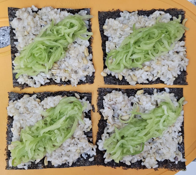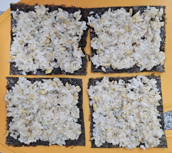 6. 김밥김은 4 등분해서 김 위에 밥을 얇게 깔아주세요.
