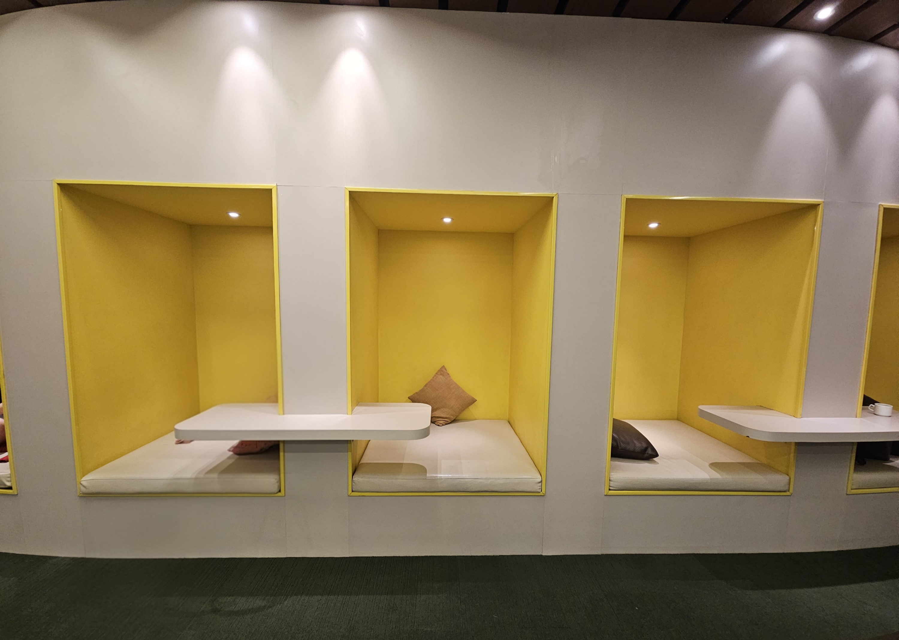 아늑한 조명과 소음이 적어 아이들이 앉아서 쉬거나 잠시 눈을 붙이기 좋았습니다. 의자와 테이블이 충분했고 의자의 종류가 많아 아이들이 맘에 드는 곳에 골라 앉을 수 있어 더욱 좋아했습니다. 노란색이 시선을 끄는 이 자리는 아이들이 있는 분들이 가장 선호했어요. 아마도 잠시라도 누울 수 있는 공간이라 그런 것 같았습니다. 저도 여기서 웅크려야 했지만 누워서 잠시 졸았네요.
