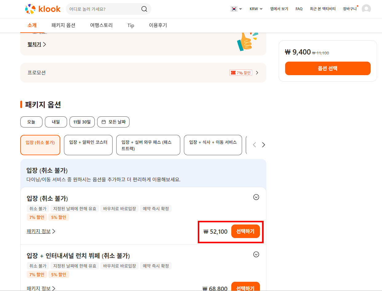 하루 전까지 무료로 취소가 가능해서 좋아요. 소인금액으로 나와있구요 성인으로 구매하면 1인당 5만원이 넘네요.