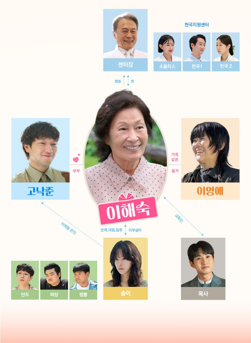• 이해숙 (김혜자) : 80세의 나이로 천국에 도착한 후, 젊어진 남편과 재회하며 천국에서의 새로운 삶을 시작합니다.