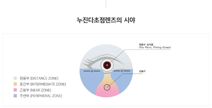 다초점 렌즈안경은 하나의 렌즈에 여러 초점 거리를 포함하여, 가까운 거리부터 먼 거리까지 모두 선명하게 볼 수 있도록 설계되어 있습니다. 가운데를 기준으로 위쪽 부분은 먼 거리, 가운데 부분은 중간거리, 아래 부분은 가까운 거리를 볼 수 있도록 되어있습니다. 쉽게 설명하자면, 돋보기와 일반안경이 합쳐진 거라 생각하시면 됩니다.