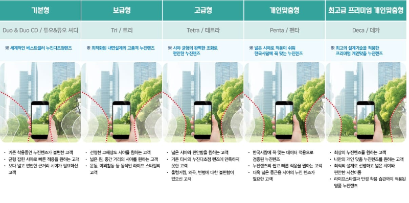처음 다초점렌즈 안경을 하게 될 경우 가성비를 생각해 고급형보다는 기본형이나 보급형을 추전해 드립니다. 혹시나 이 안경이 어지러움이나 다른 부작용 때문에 사용을 못하는 분들이 간혹 계시다고 합니다. 처음에는 내 눈이 잘 적응하는지 나에게 부작용을 없는지 등을 위해 그나마 낮은 가격대를 선택하시는 게 부담이 적겠죠. 이 단계의 렌즈도 안경테와 렌즈가격을 고려하면 보통 40~50만 원대를 형성하고 있습니다.