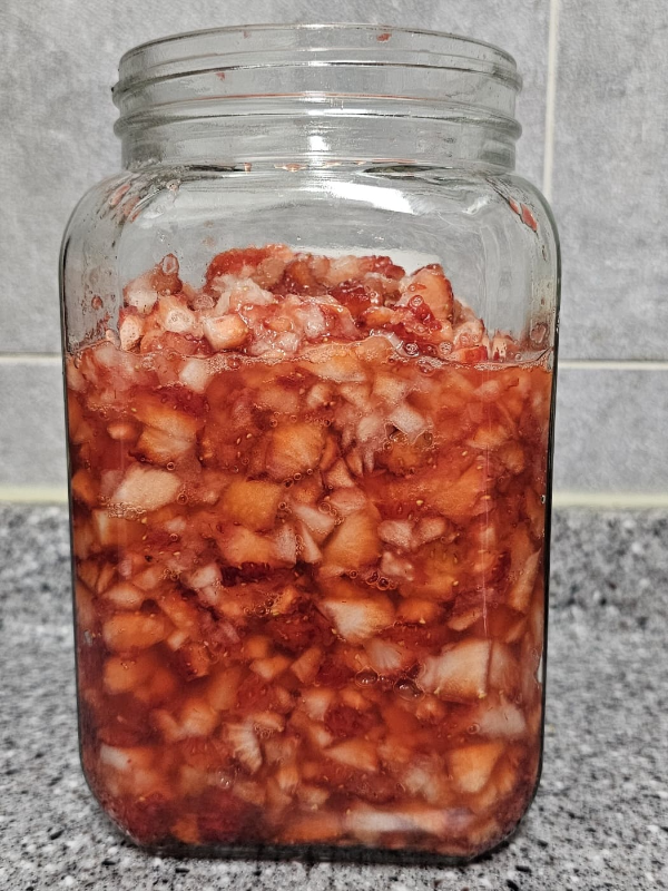 딸기 2kg가 1.5리터 병에 가득 차네요. 이렇게 설탕까지 올리면 완성!