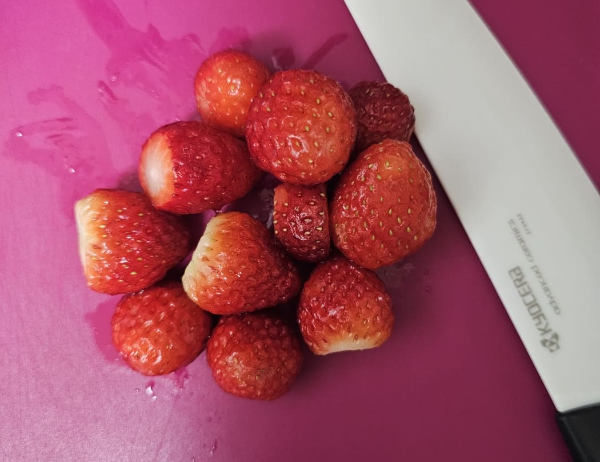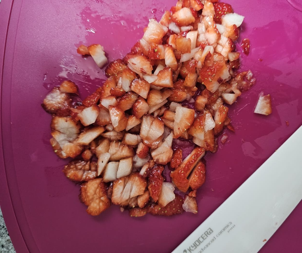 3. 이제 딸기를 다져줍니다. 믹서기에 갈아도 되지만 우리 집 애들은 씹히는 맛이 좋다며 믹서기에 못 갈게 해요. 엄마 고생시키는 법을 아는 녀석들이죠.