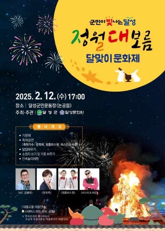 이번 정월대보름에는 대구와 경북 곳곳에서 다채로운 행사가 열리니, 가까운 행사장을 방문하여 가족, 친구들과 함께 전통문화를 체험하고 풍성한 명절 분위기를 즐겨보시기 바랍니다.