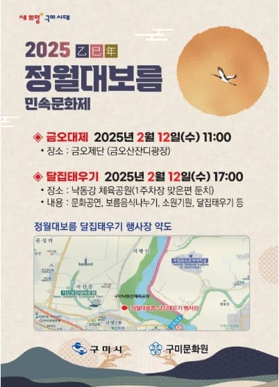 구미시에서는 금오산 잔디광장 금오제단에서 금오대제를 시작으로 낙동강 체육공원 1 주차장 앞 둔치에서 달집 태우기 행사가 열립니다. 또한 지신밟기, 대북공연, 퓨전국악 공연 등 다양한 문화공연이 펼쳐지며, 대보름 음식 나누기, 제기차기 등 전통놀이 체험도 마련되어 시민들이 함께 참여할 수 있습니다.