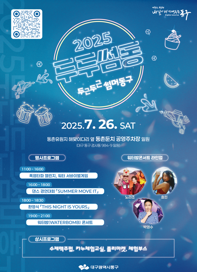 올해도 뜨거운 여름, 대프리카인 대구 동구에서는 '두두썸동 여름 폭염축제'라는 이름으로 2025년 폭염 극복 축제가 열립니다. 이 축제는 지역 주민과 관광객 모두를 위한 다채로운 프로그램과 함께, 광역 대구 동구 여름 축제로 자리매김하고 있어요.