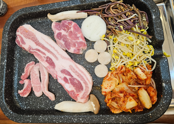 저는 아이와 함께 매운걸 잘 못 먹는 편이라 돼지고기구이 한판을 시켜서 먹고 시그니처메뉴인 돼지찌개는 집에 가서 먹을 수 있도록 포장주문을 하였습니다.