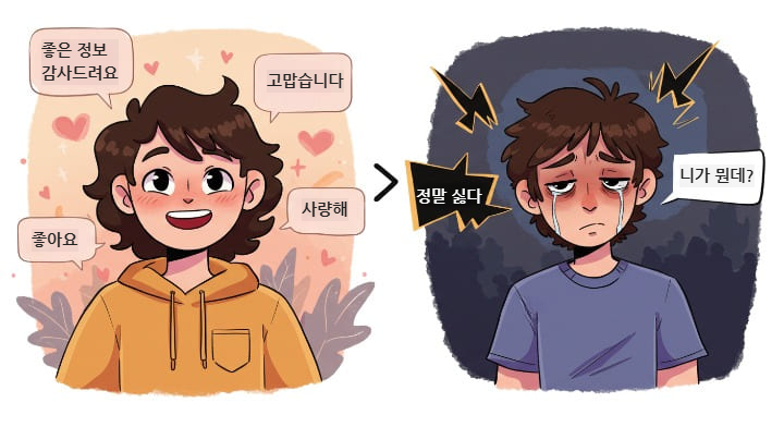스마트폰으로 친구에게 메시지를 보낼 때, 말투나 이모티콘이 기분을 좋게도, 나쁘게도 만들 수 있어요.
