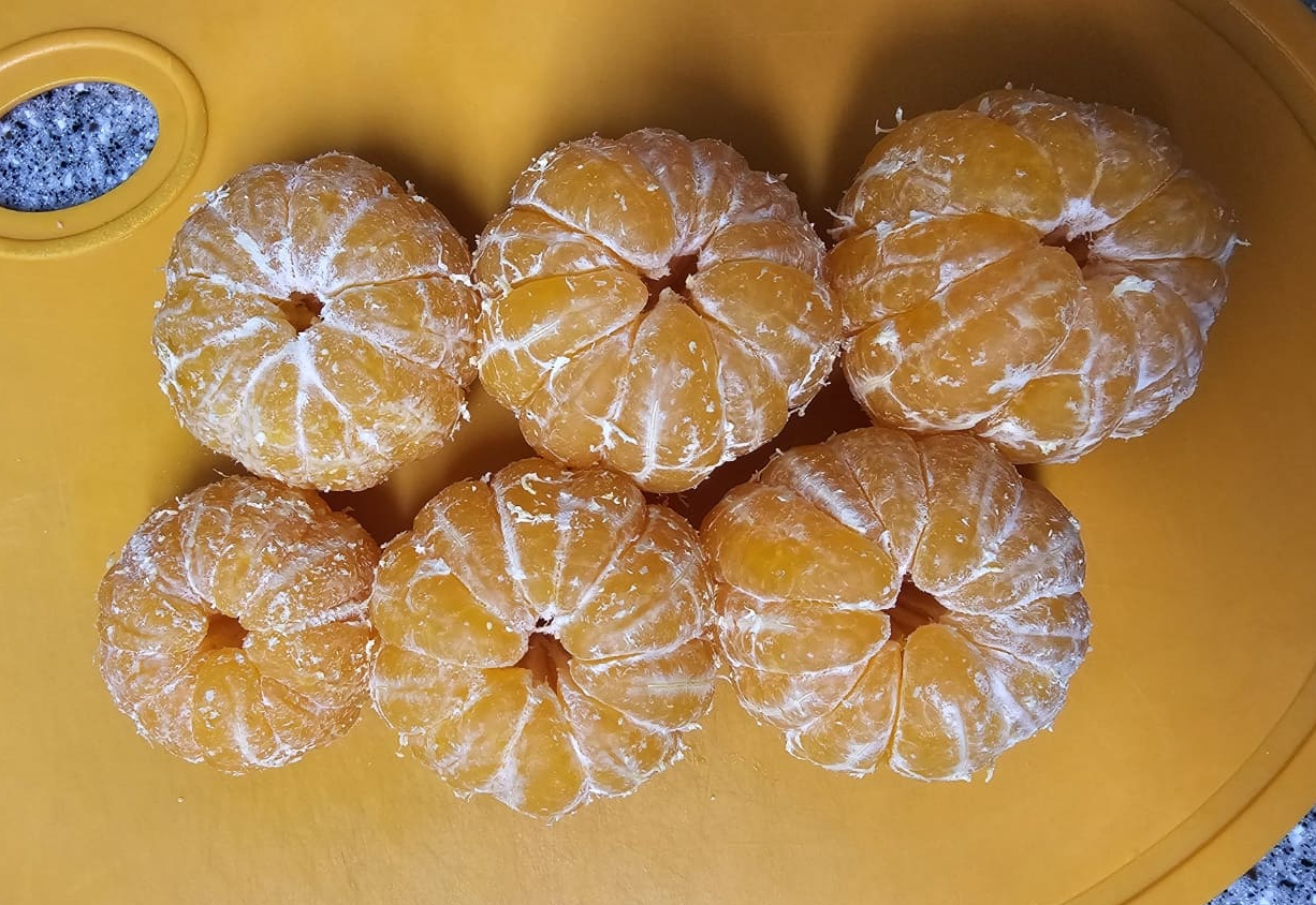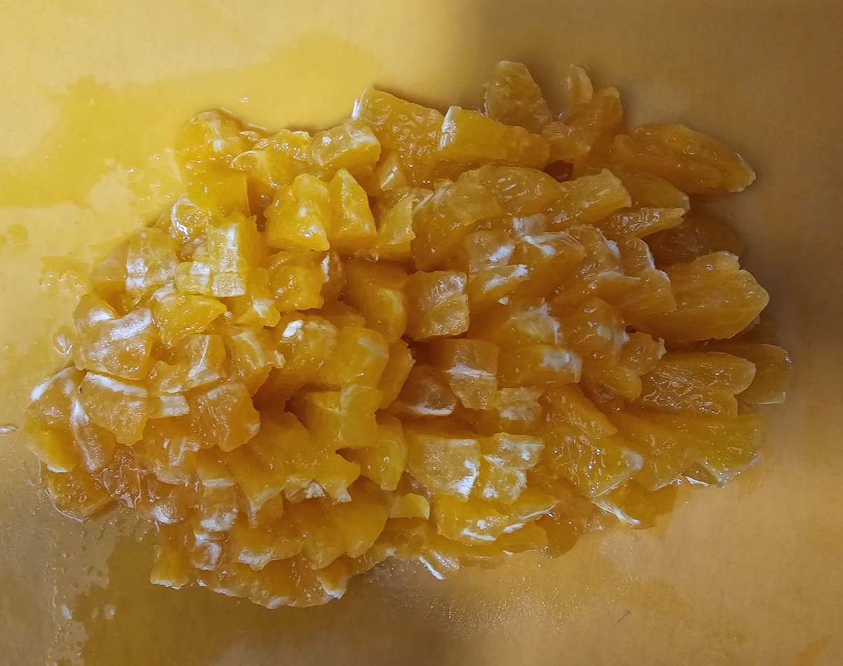 2. 껍질을 제거한 귤을 적당한 크기로 잘라줍니다. 귤을 자를때 팁을 드리자면 너무 잘게 자르면 과즙이 많이 흘러내려서 용기에 담을 때 많이 흘러 불편하므로 슬라이스 한 다음 몇 번 더 잘라주시면 됩니다. 그리고 속껍질 부분을 아래쪽으로 해서 자르면 즙이 덜 흘러요.
