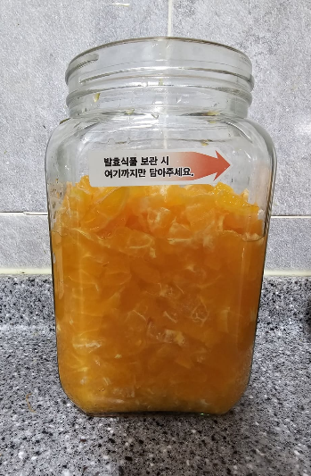밀폐용기는 유리병을 사용했을 때가 가장 좋은 것 같습니다. 꼭 소독을 할 필요는 없지만 깨끗이 세척 후 물기는 꼭 다 닦고 과일청을 담그셔야 해요. 그렇지 않으면 곰팡이가 생기거나 맛이 변질될 수 있기 때문입니다.