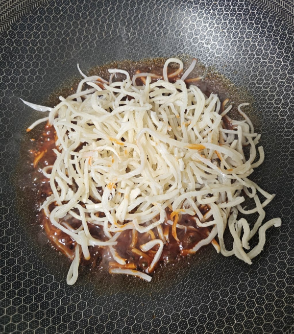 바글바글 끓어오르면 불을 끄고 씻어서 물기를 뺀 오징어채를 넣어 버무려주세요.