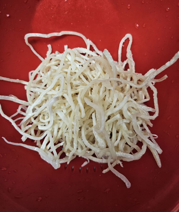 1. 진미채를 물에 살짝 씻어 체에 밭쳐 물기를 제거합니다. 물에 씻는 이유는 진미채 자체의 짠맛을 중화시키고 부드럽게 해 주기 위해서입니다. 물에 살짝 담갔다 빼는 정도만 해주시면 돼요. 너무 많이 씻거나 오래 담가두면 진미채가 흐물거려 식감을 잃어버려요.