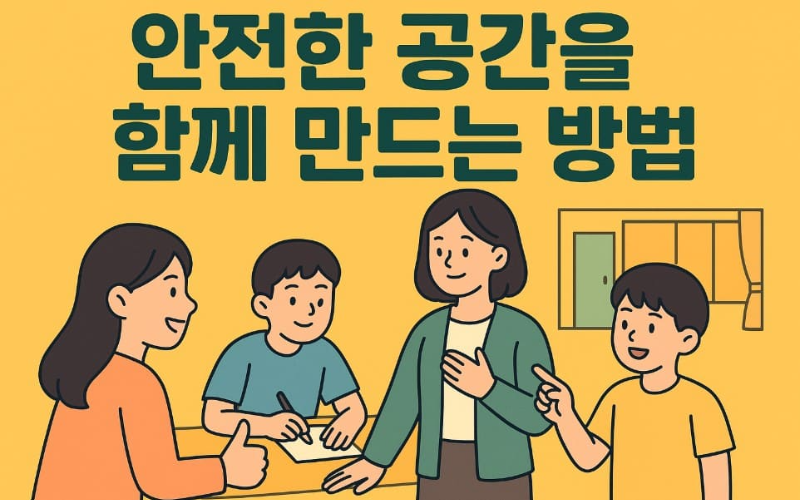 안전한 공간은 ‘누군가’가 만들어주는 것이 아니라, 우리 모두가 함께 만드는 것이에요. 따뜻한 말 한마디, 배려하는 행동, 작은 정리정돈, 그리고 서로의 다름을 인정하는 마음이 모이면 학교는 훨씬 더 따뜻하고 편안한 공간으로 바뀔 수 있답니다.