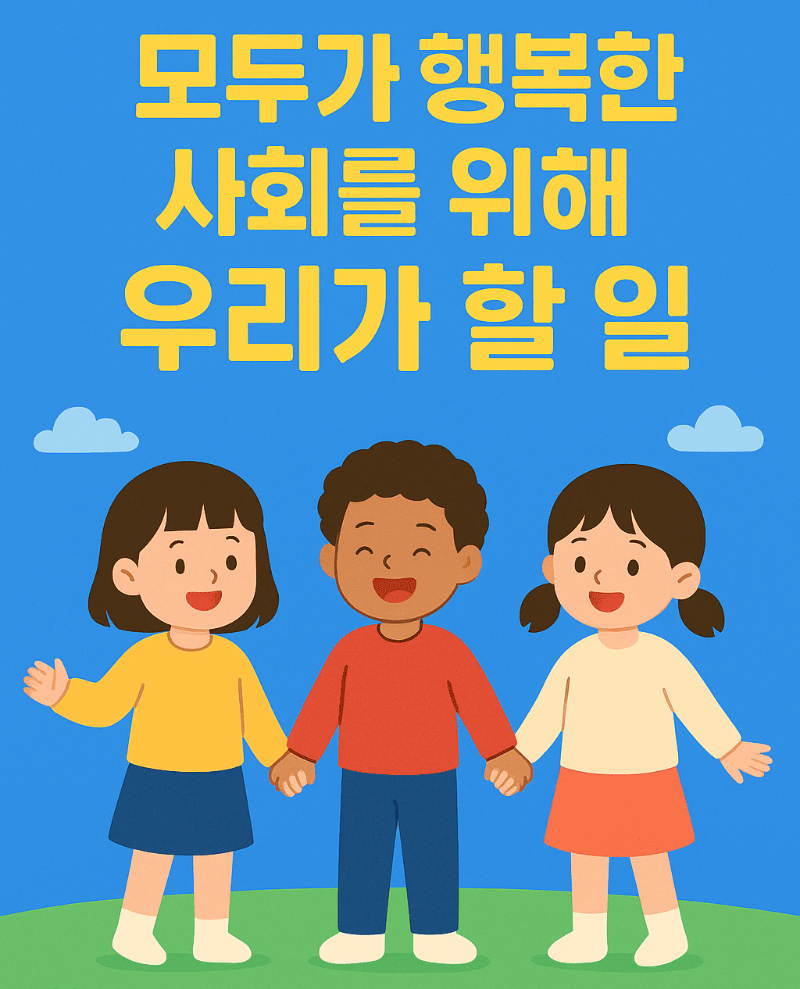 여러분은 “행복한 사회”가 어떤 모습이라고 생각하나요? 모두가 웃고, 서로 도와주며, 안전하게 살아가는 사회일 거예요. 그런 사회를 만들기 위해서는 우리 모두의 노력이 필요하답니다.
