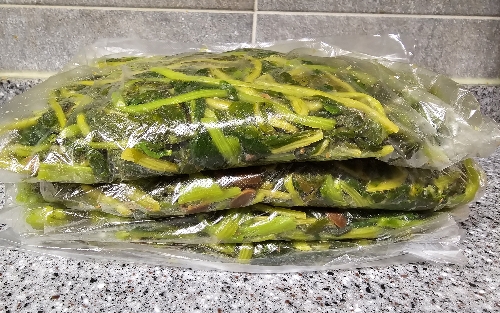 시래기를 냉동실에 보관할 때에도 한번씩 먹을양을 지퍼백에 소분하여 편평하게 눌러 차곡차곡 쌓아 둡니다.