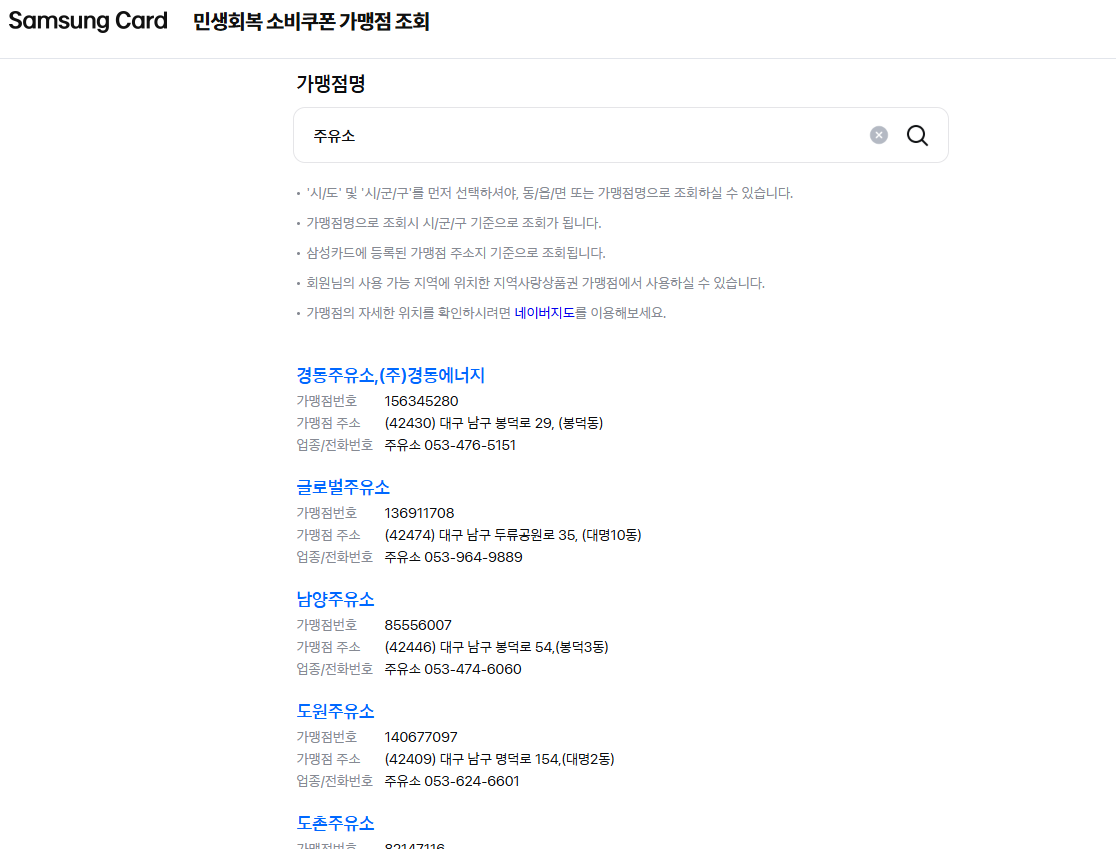 - 삼성카드 홈페이지 또는 앱 → 민생회복소비쿠폰 클릭 → 사용 가맹점 조회 → 시/도, 시/군/구, 읍/면/동선택 → 가맹점명에 주유소 입력 후 돋보기 클릭 → 스크롤하여 화면 내리면 리스트 내역이 나옵니다.