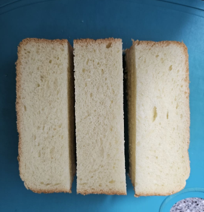 식빵 한 장을 3등분 크기로 잘라주세요. 껍질 부분은 제거해도 되지만, 그대로 두면 더 바삭하게 구워져요.