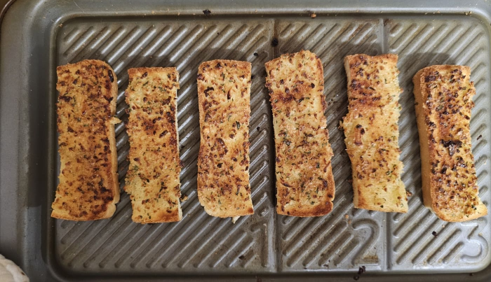 이번에도 중간에 위치를 바꿔주었어요. 조금만 넣어서 그런가 에어프라이보다 토스트 기능으로 한 마늘빵이 더 바삭하고 맛있어요. 타지도 않았고요.