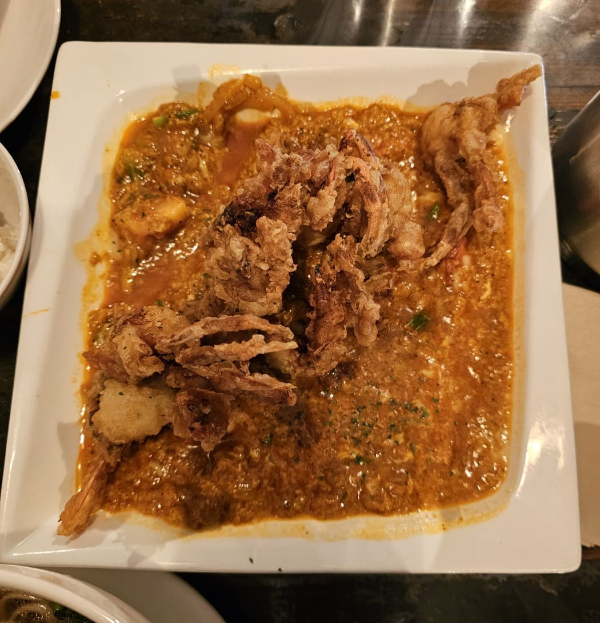 태국의 대표적인 게 요리로, 고소한 코코넛 밀크와 달걀이 어우러진 카레 소스가 특징입니다.. 살짝 매콤한 소스와 바삭하면서도 부드러운 게살과 잘 어우러져 정말 맛있습니다. 공깃밥 한 개가 함께 주어지는데 밥과 함께 먹으면 매콤하지만 계속 들어가는 맛이에요.