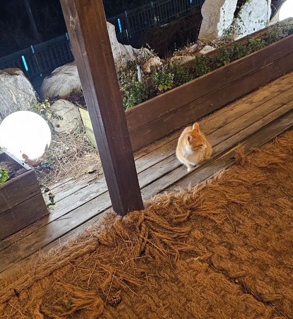 야외 테라스자리라 추웠지만 담요가 준비되어 있어 좋았네요. 그리고 야외라 길 고양이들이 왔다 갔다 하는 모습도 볼 수 있었어요. 이렇게 귀여운 아기 고양이가 밥 먹는 동안 저희를 보더라고요. 간이 세고 향신료가 많이 들어가는 음식이라 줄 수가 없네요.