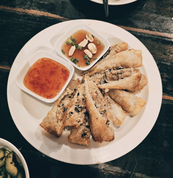 처음으로 나온 건 스프링롤. 바삭한 튀김옷 안에 당면과 채소가 가득 들어 있어요. 한 입 베어 물자 바삭하고 고소하면서도 담백한 맛이 입안 가득 퍼지네요. 바삭한 식감에 아이들도 잘 먹어요. 두 가지 소스로 하나는 스위트칠리소스. 하나는 볶음땅콩이 통으로 있는 간장소스입니다. 소스를 곁들이지 않아도 맛있더라고요.