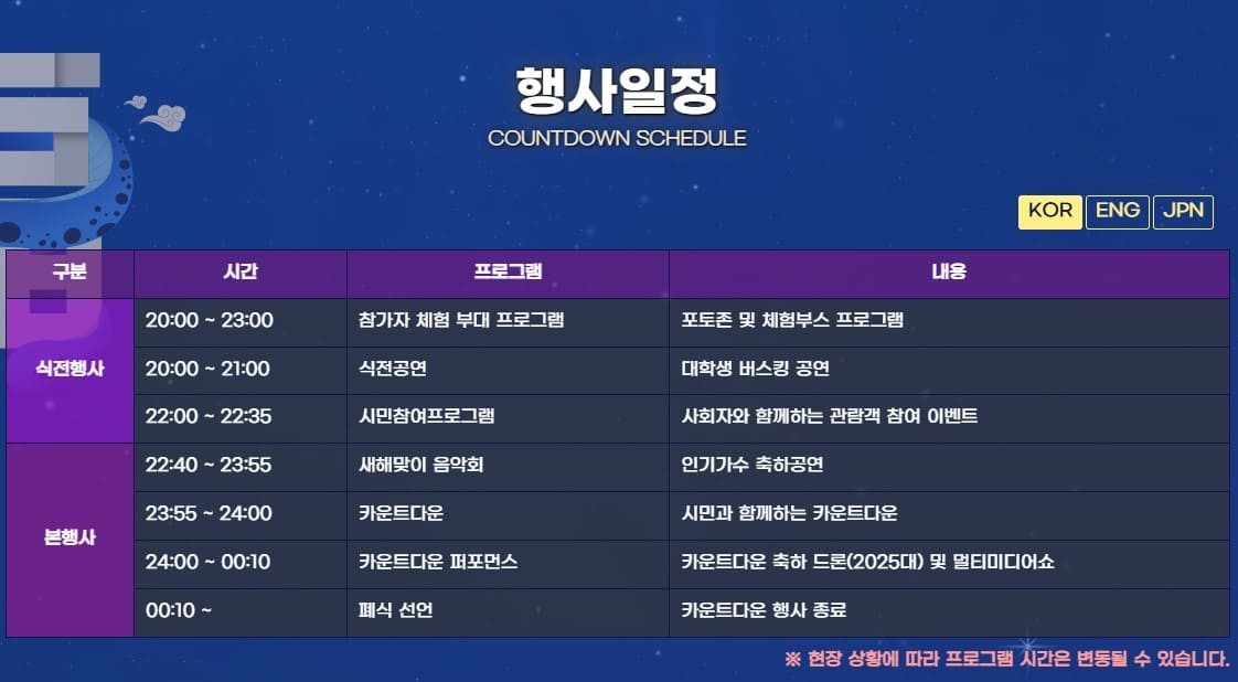 -일시 : 2024년 12월 31일 오후 10시 ~ 2025년 1월 1일 오전 12시 10분 (행사장 입장은 19:00부터 선착순 1,200명 입장)