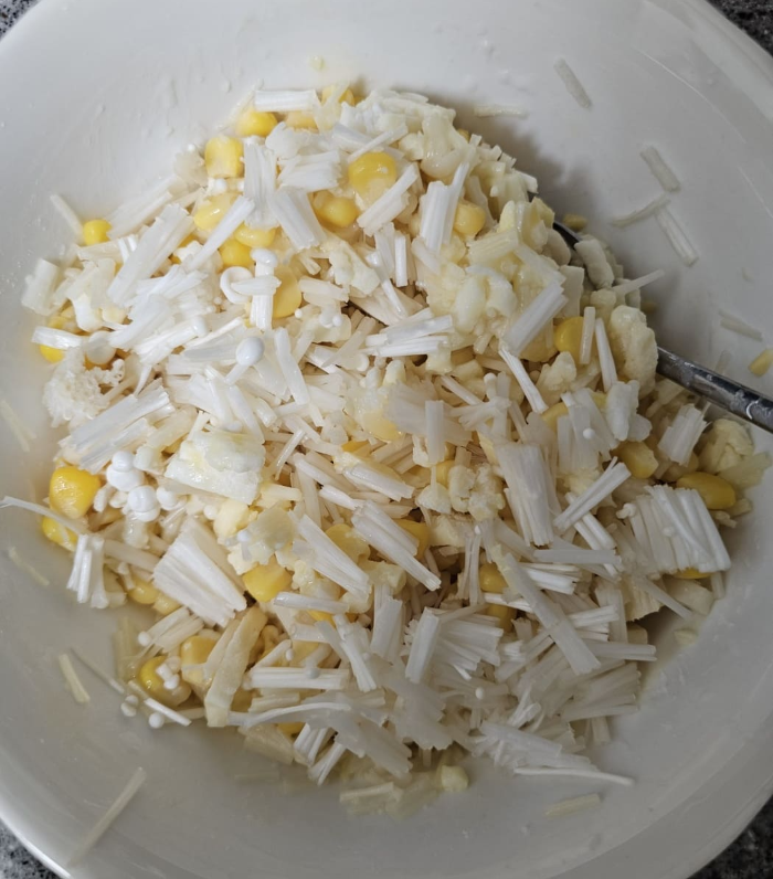 커다란 볼에 손질한 팽이버섯, 옥수수, 치즈, 전분을 넣고 소금 한 꼬집, 후추 약간 넣고 잘 섞어주세요. 이때, 반죽이 너무 묽지 않게 해 주세요.