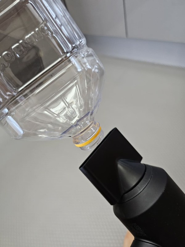 페트병 입구를 아래로 향하게 잡아요. 그리고 드라이어의 찬바람을 병 입구에 직접 쏩니다. 내부의 물기가 증발하면서 빠르게 건조가 됩니다.