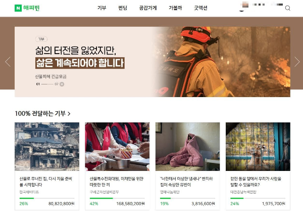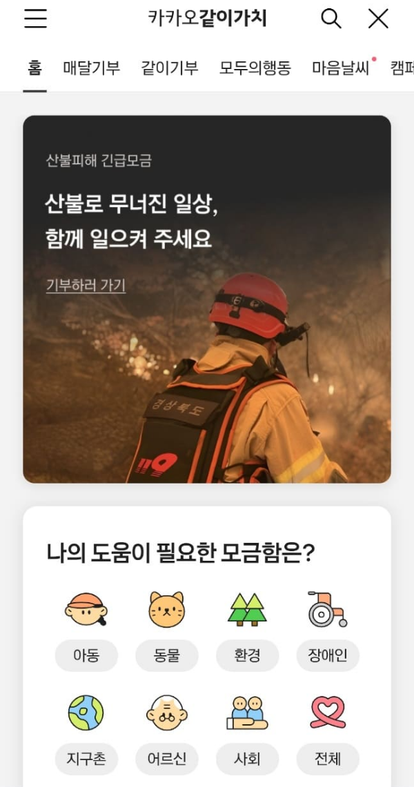 카카오는 메인 페이지에 산불피해 긴급모금을 메인을 띄워 놓아서 기부하기 더 편하실 것 같네요.