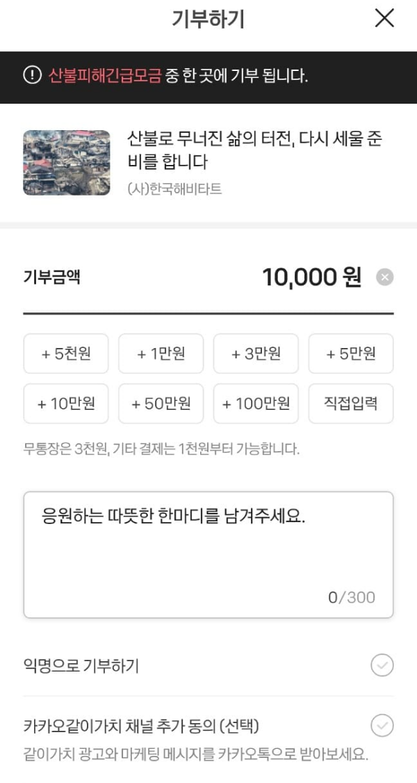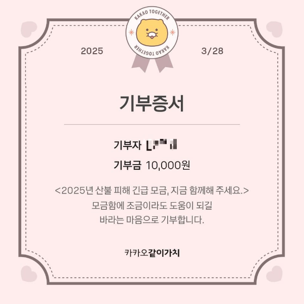 카카오에도 똑같이 1만원 기부합니다.