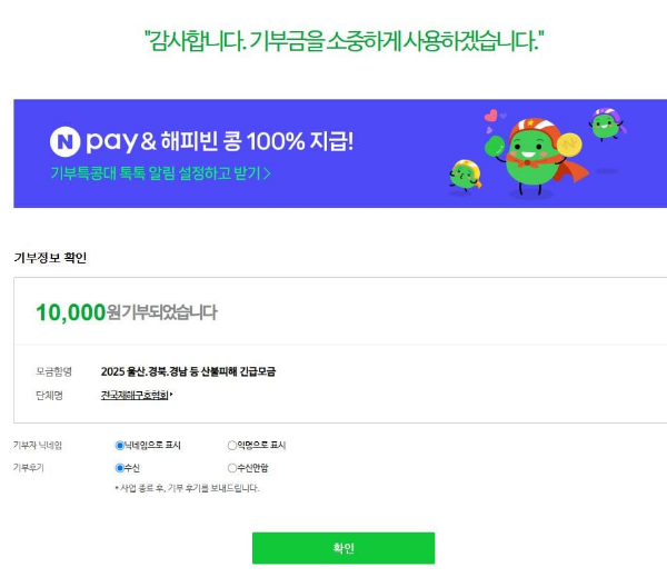 이렇게 이용약관에 동의 후 기부하기를 누르시면 네이버페이로 결제가 됩니다.