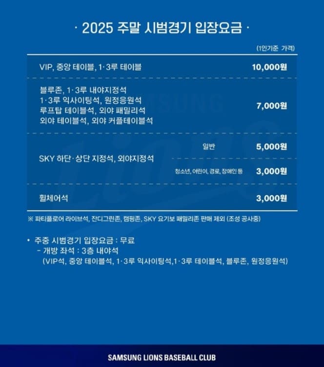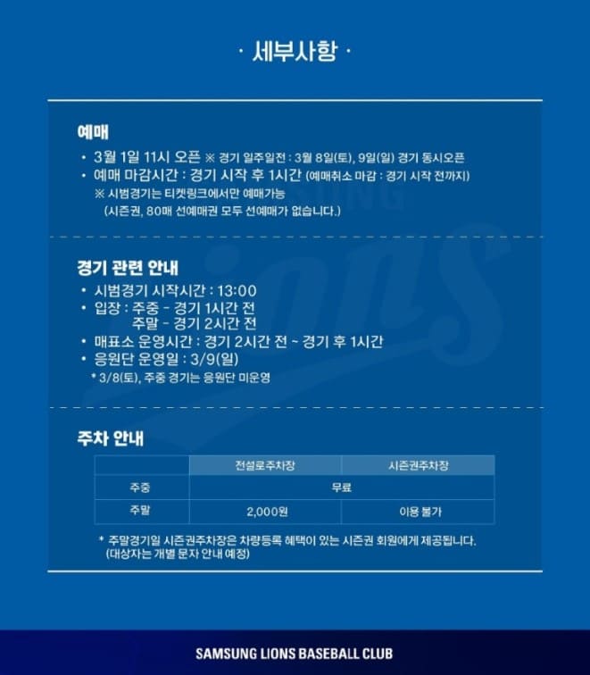 시범 경기는 시즌권, 선예매권 모두 상관없이 동일한 시간에 오픈되었습니다. 3월 1일 오전 11시 오픈이었어요. 당일 현장에서도 입장이 가능합니다. 경기 시작 30분 전부터 입장이 가능하며, 좌석은 선착순으로 배정됩니다. 또한, 경기 당일에는 매점과 주차장도 정상 운영됩니다. 주차 요금은 평일은 무료이지만 주말에는 2,000원입니다.