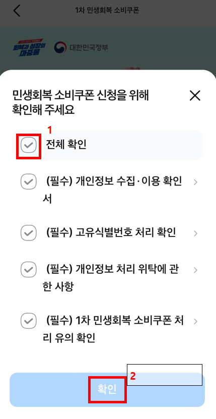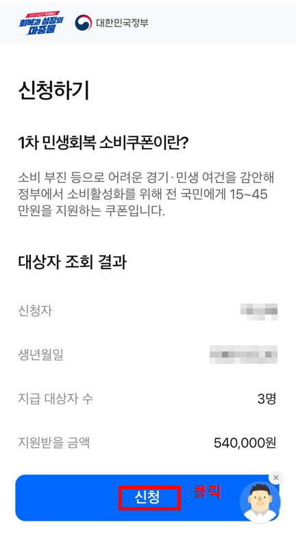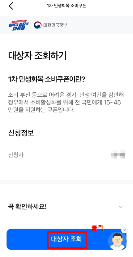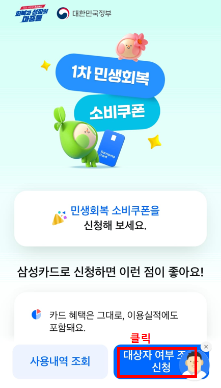 1. 삼성카드앱 접속 → 민생회복소비쿠폰신청하기 클릭 → 대상자여부 조회/신청