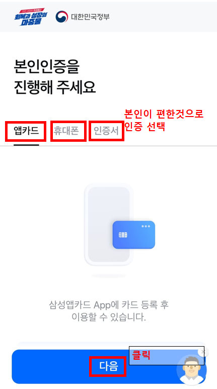 2. 본인인증(앱카드, 핸드폰, 인증서) 후 대상자 조회하기 - 핸드폰으로 인증하기 했습니다.
